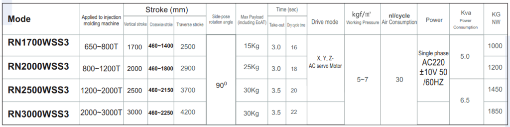 Large full servo traverse robot, this series are mainly applied to 650~3000T horizontal injection molding machines to take out the finished product. Telescopic arms are adopted. Vertical, crosswise and traverse strokes are driven by AC servo motor. Low noise THK (JP) or PMI (Taiwan) linear guideway is used to guarantee quiet and stable movement. The complete set includes standard accessories.