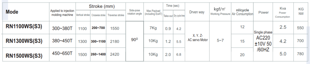 Large full servo traverse robot, this series are mainly applied to 300~650T horizontal injection molding machines to take out the finished product. Telescopic arms are adopted. AC servo motor can be added to take out sprue. Vertical, crosswise and traverse strokes are driven by AC servo motor. Low noise THK (JP) or PMI (Taiwan) linear guideway is used to guarantee quiet and stable movement. The complete set includes standard accessories.