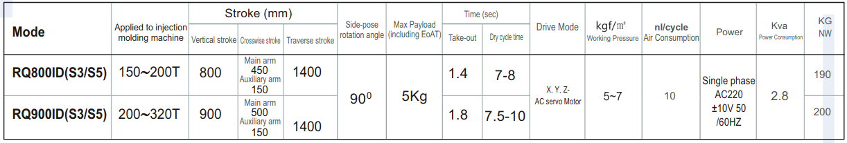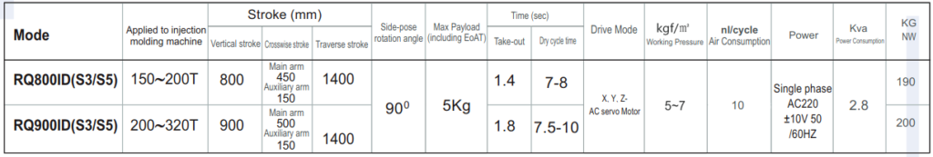 Medium full servo traverse robot, this series are mainly applied to 150~320T horizontal injection molding machines to take out the finished product. Single stage arms are adopted. AC servo motor can be added to take out sprue. Vertical, crosswise and traverse strokes are driven by AC servo motor. low noise THK (JP) or PMI (Taiwan) linear guideway is used to guarantee quiet and stable movement. The complete set includes standard accessories.